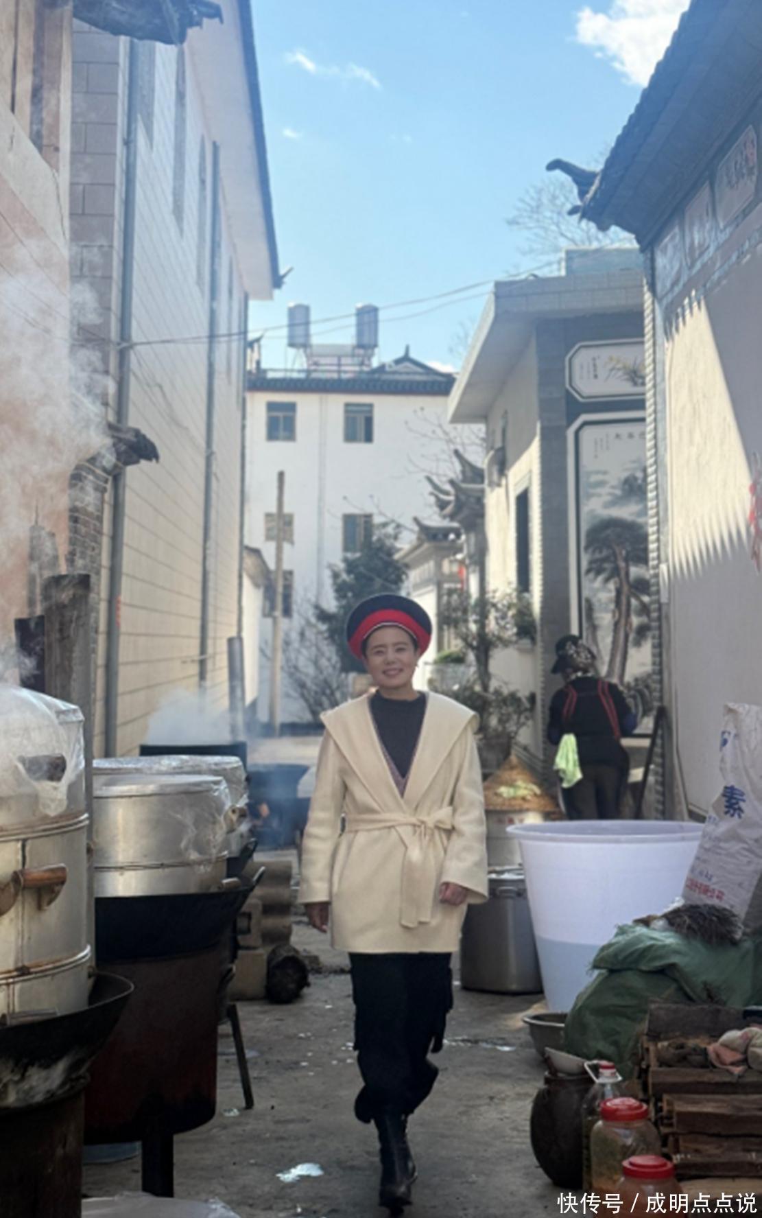 她那天穿得简单又精神:黑毛衣配白大衣,黑长裤利落,头顶一顶白族帽子,淡妆也挡不住眼角的笑意。站C位和七个白族姑娘比心合影,压根看不出年龄差——单身后的她,反而越活越舒展。